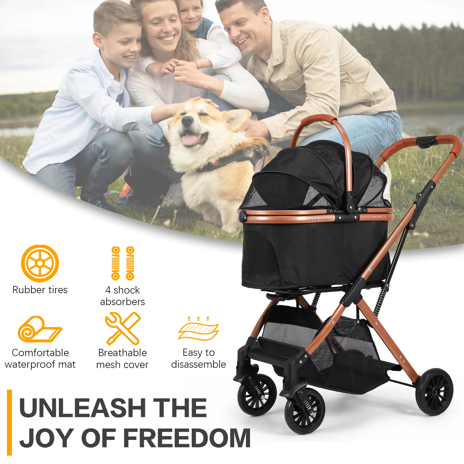 Folding Stroller All Terrain 4 Wheels Puppy Cage Jogger Stroller with Detachable Carrier with Sun Shades for Large & Medium Dogs