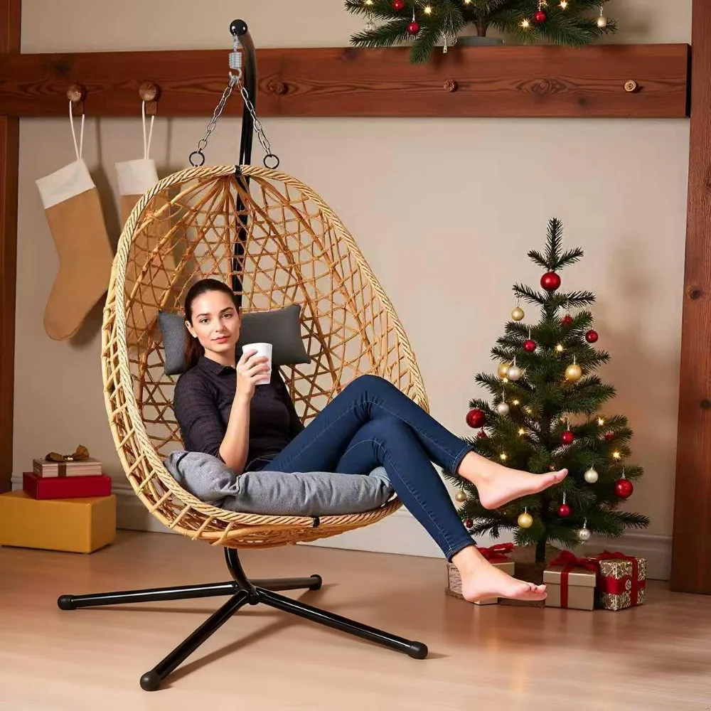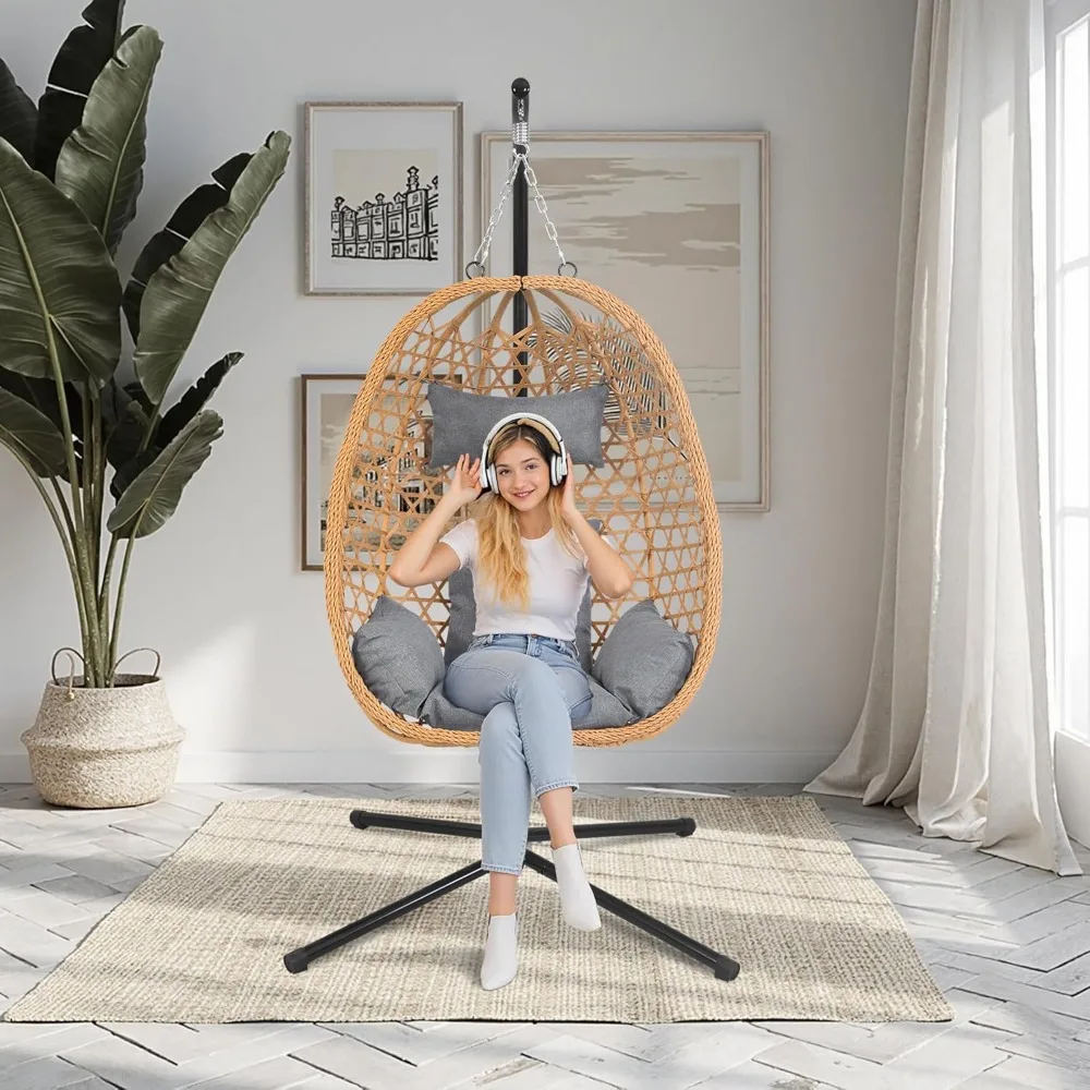 Hanging Egg Chair with Stand & Cushions – All-Weather Rattan Swing Chair for Patio, Balcony, Garden
